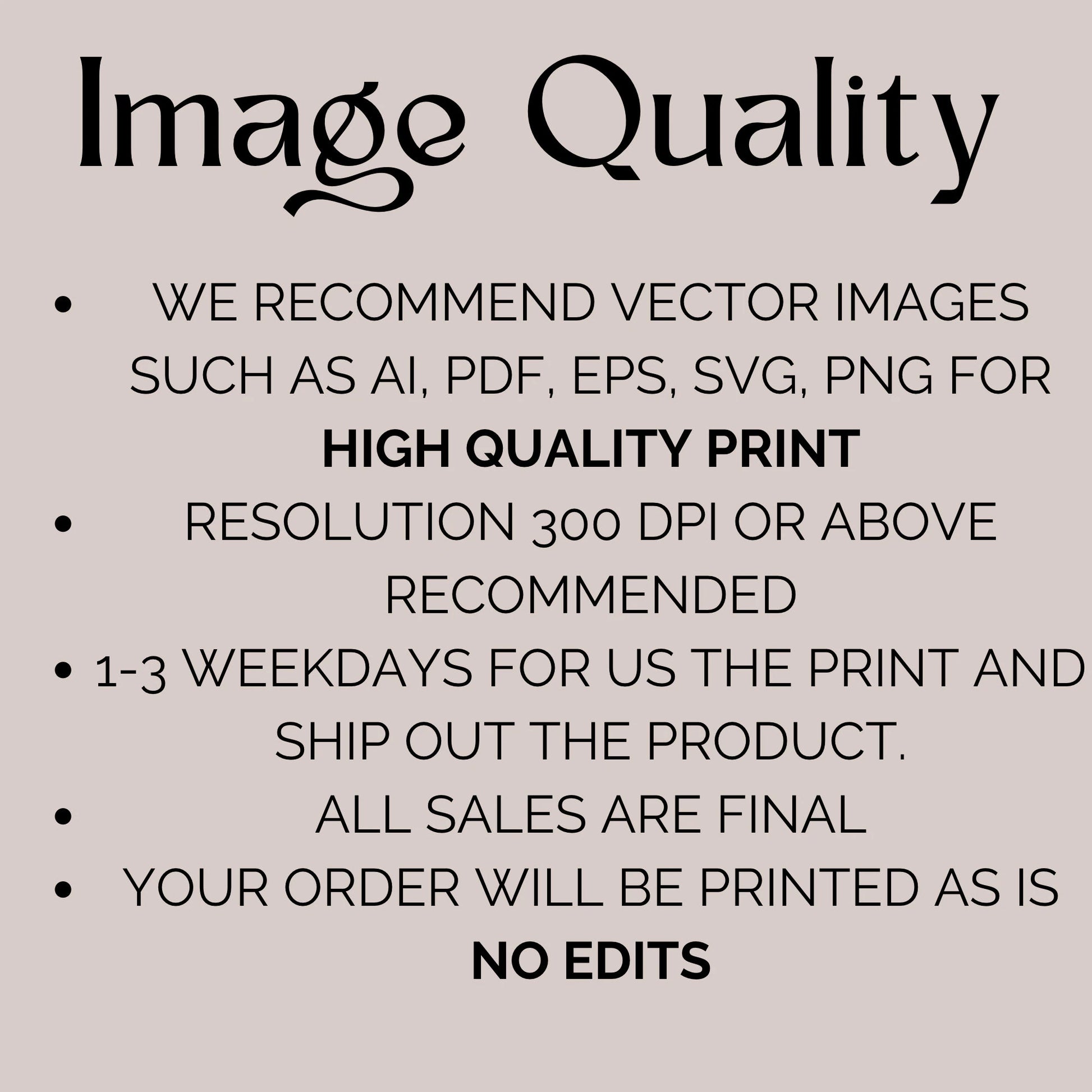 PLEASE Only use high definition images 300dpi or higher. The best files to print are in a PNG or Svg file in Transparent format.